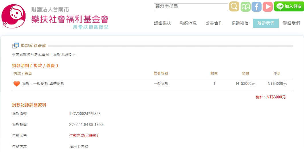 愛心款項$3,000元,已捐給您指定的【台南市樂扶社會福利慈善事業基金會】