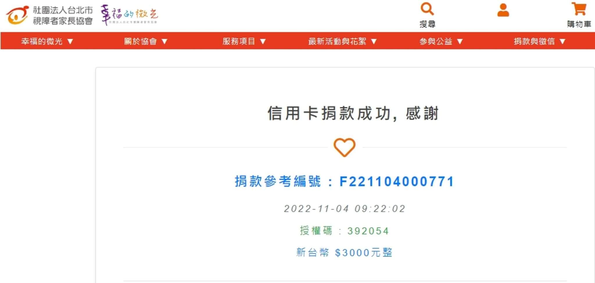 愛心款項$3,000元,已捐給您指定的【社團法人台北市視障者家長協會】
