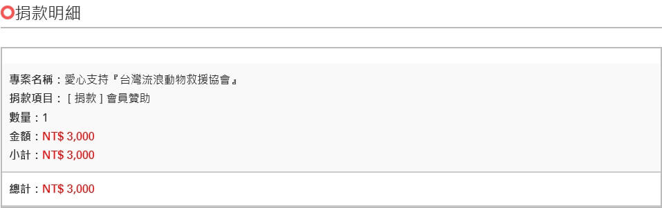 愛心款項$3,000元,已捐給您指定的【社團法人台灣流浪動物救援協會】