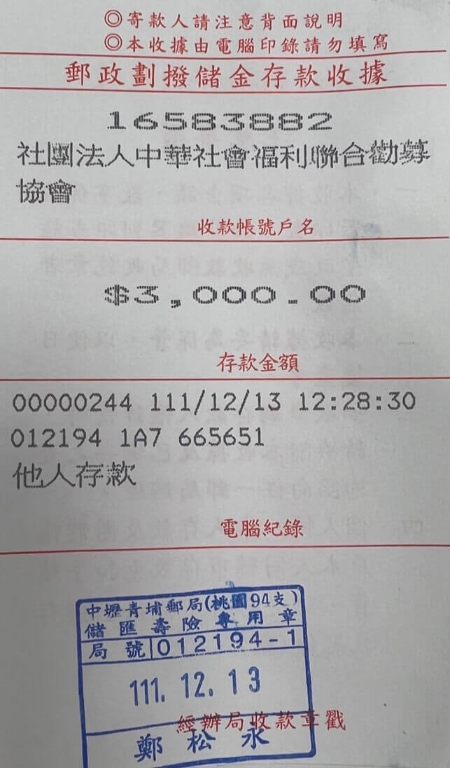 愛心款項$3,000元,已捐給您指定的【社團法人中華社會福利聯合勸募協會】