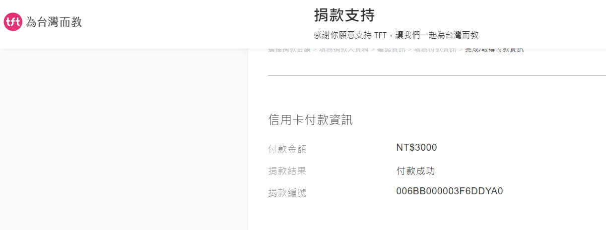 愛心款項$3,000元,已捐給您指定的【財團法人為台灣而教教育基金會】