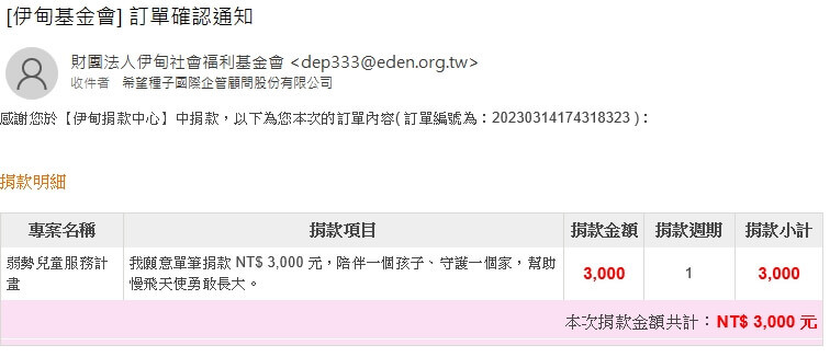 愛心款項$3,000元,已捐給您指定的【財團法人伊甸社會福利基金會】