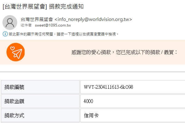 愛心款項$4,000元,已捐給您指定的【台灣世界展望會】