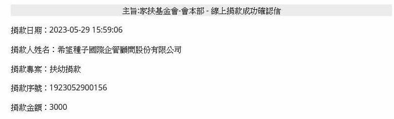 愛心款項$3,000元,已捐給您指定的【財團法人台灣兒童暨家庭扶助基金會】