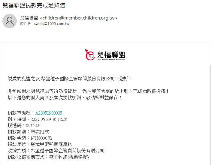 愛心款項$3,000元,已捐給您指定的【財團法人中華民國兒童福利聯盟文教基金會】