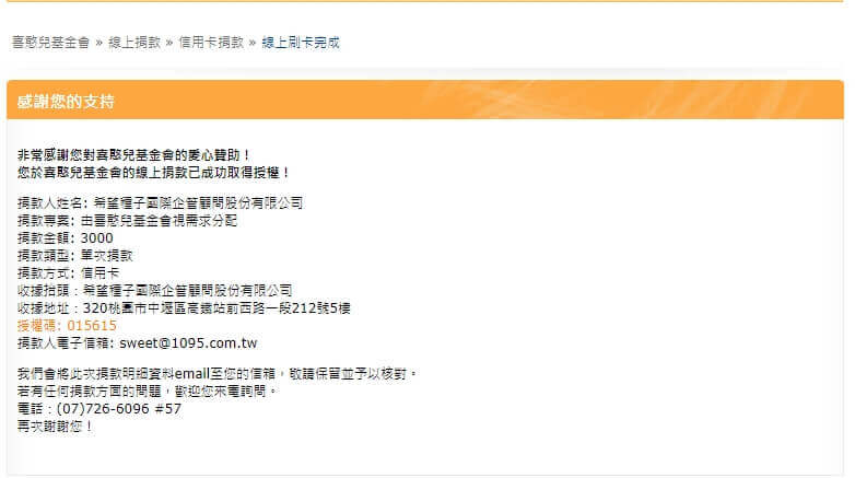 愛心款項$3,000元,已捐給您指定的【財團法人喜憨兒社會福利基金會】
