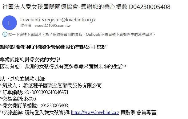 愛心款項$3,000元,已捐給您指定的【社團法人愛女孩國際關懷協會】