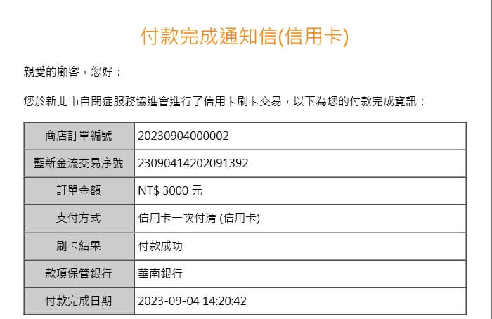 愛心款項$3,000元,已捐給您指定的【新北市自閉症服務協進會】