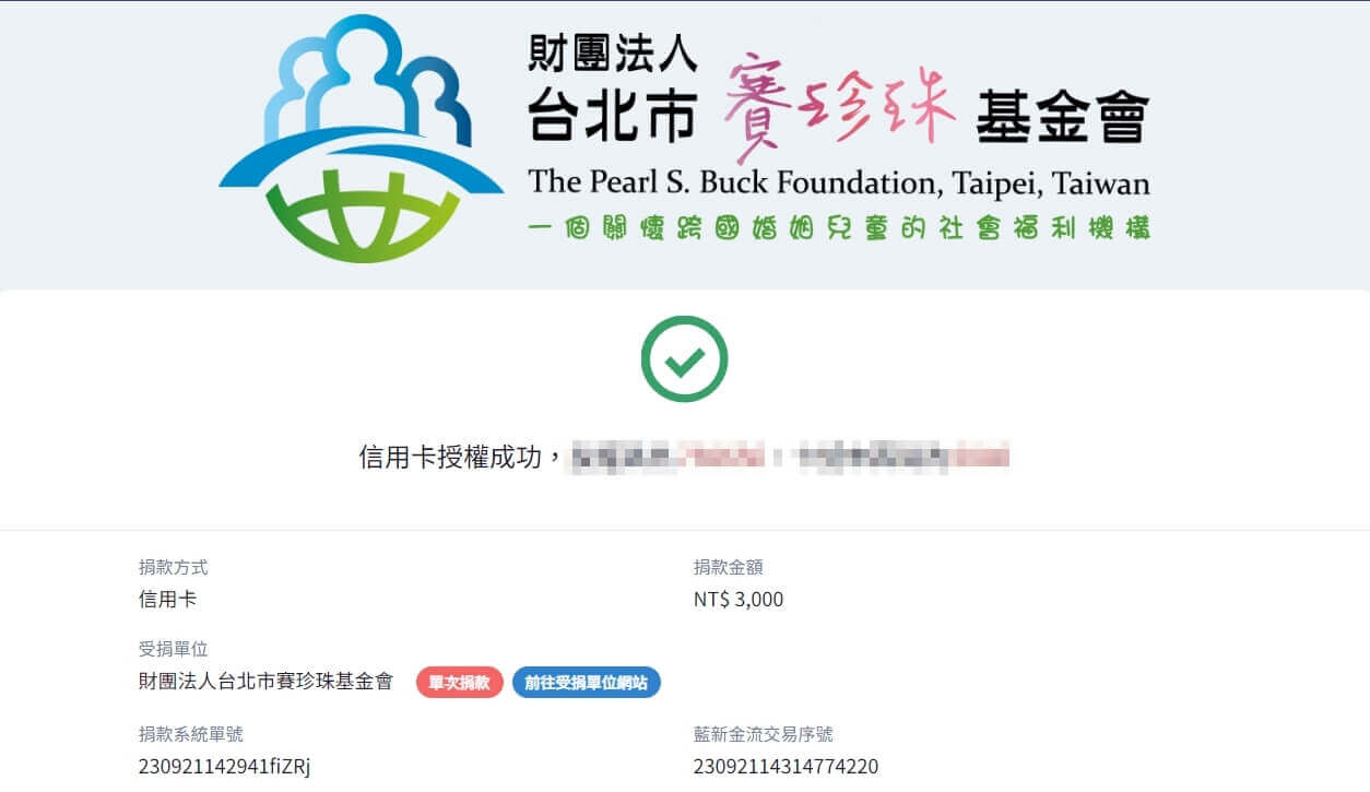 愛心款項$3,000元,已捐給您指定的【財團法人台北市賽珍珠基金會】