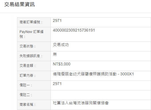 愛心款項$3,000元,已捐給您指定的【財團法人台灣流浪貓狗關懷協會】