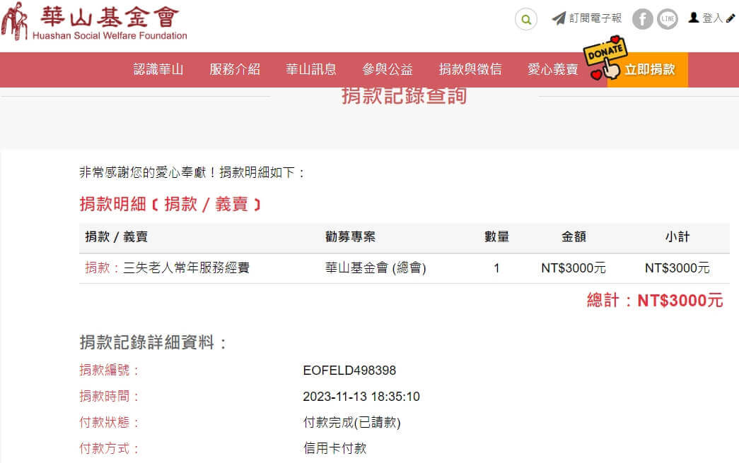 愛心款項$3,000元,已捐給您指定的【財團法人華山社會福利慈善事業基金會】
