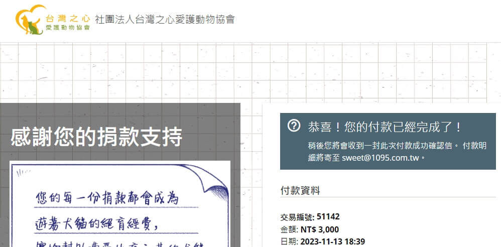 愛心款項$3,000元,已捐給您指定的【社團法人台灣之心愛護動物協會】