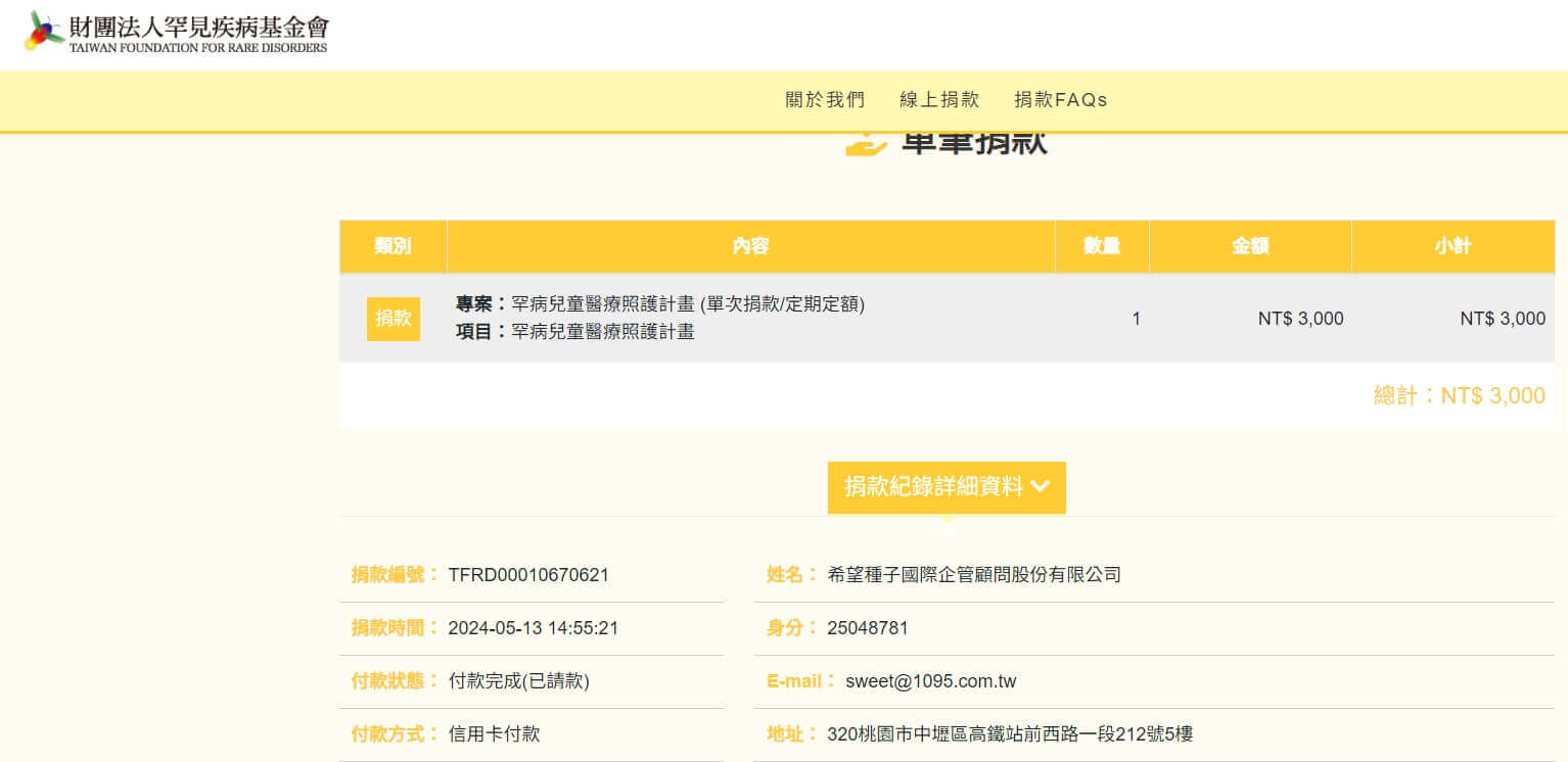 愛心款項$3,000元,已捐給您指定的【財團法人罕見疾病基金會】