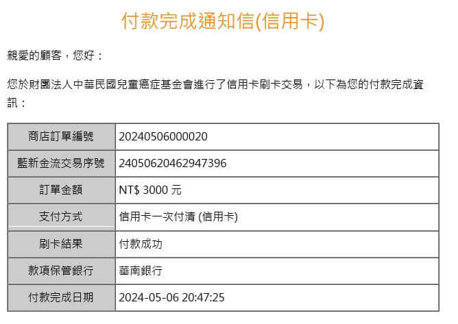 愛心款項$3,000元,已捐給您指定的【財團法人中華民國兒童癌症基金會】