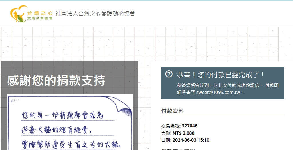 愛心款項$3,000元,已捐給您指定的【台灣之心愛護動物協會】
