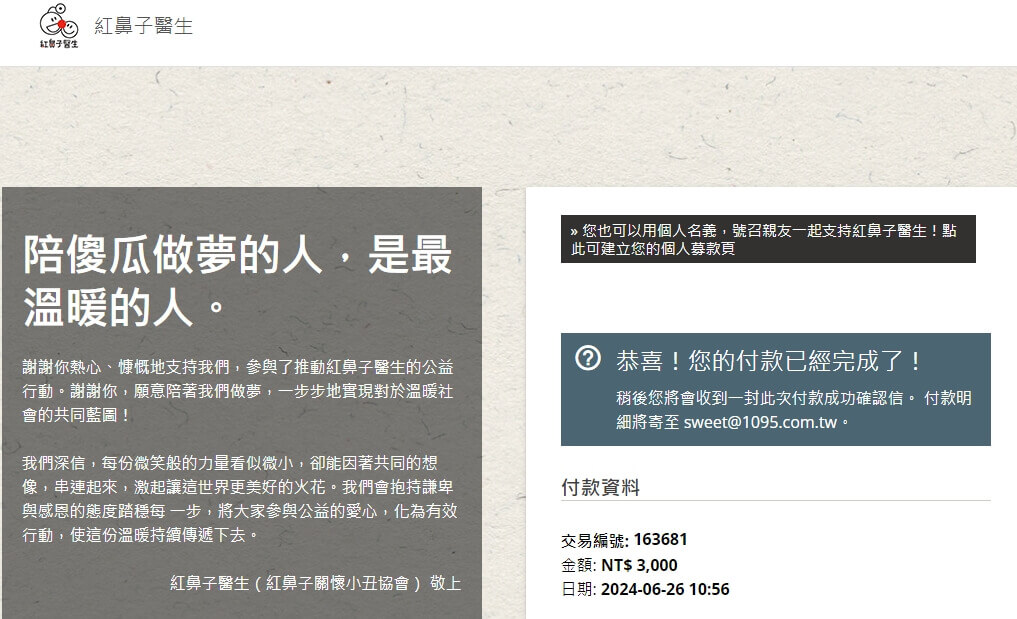 愛心款項$3,000元,已捐給您指定的【社團法人中華民國紅鼻子關懷小丑協會】
