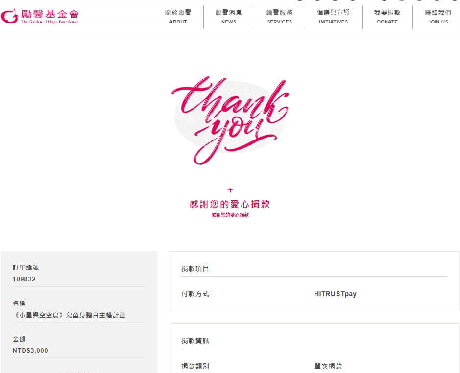 愛心款項$3,000元,已捐給您指定的【財團法人勵馨福會福利事業基金會】