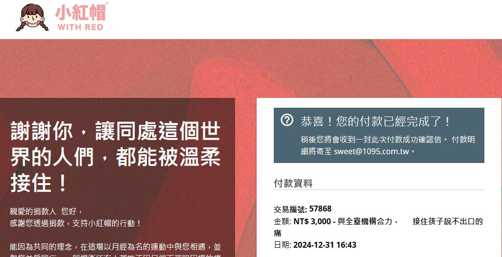 愛心款項$3,000元,已捐給您指定的【社團法人全球小紅帽協會】