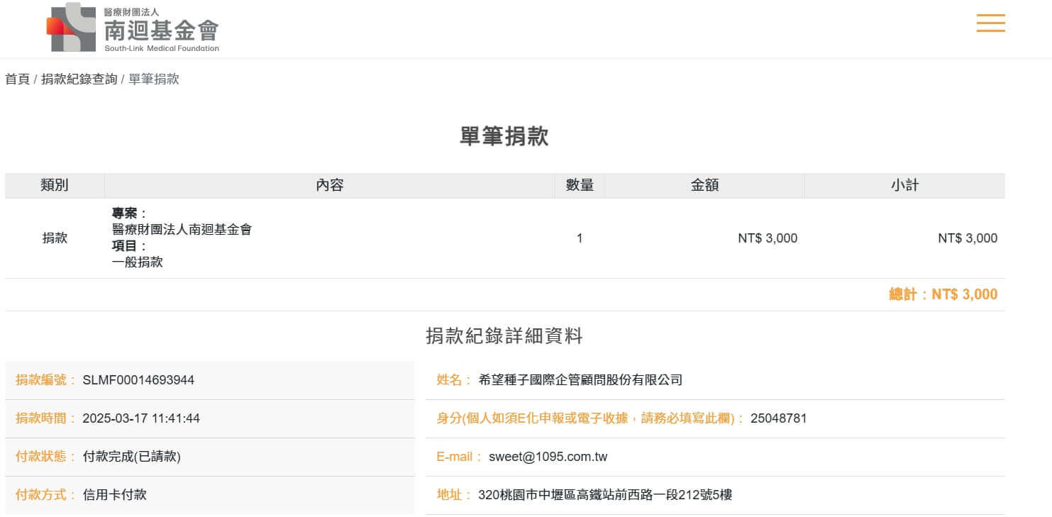 愛心款項$3,000元,已捐給您指定的【醫療財團法人南迴基金會】