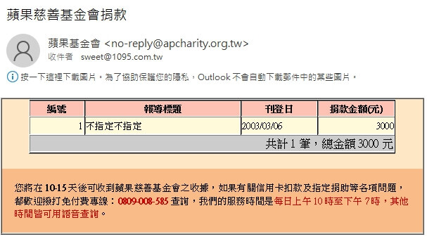 愛心款項$3,000元,已捐給您指定的【蘋果慈善基金會】