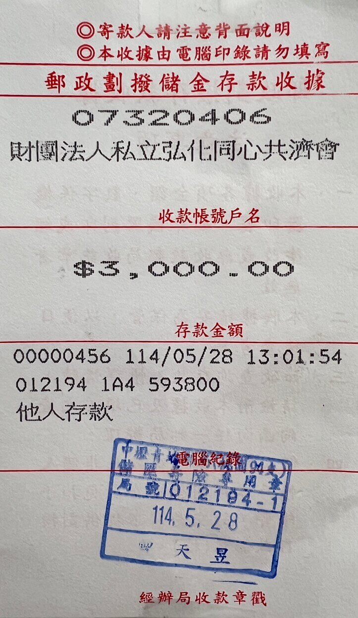 愛心款項$3,000元,已捐給您指定的【財團法人私立弘化同心共濟會】