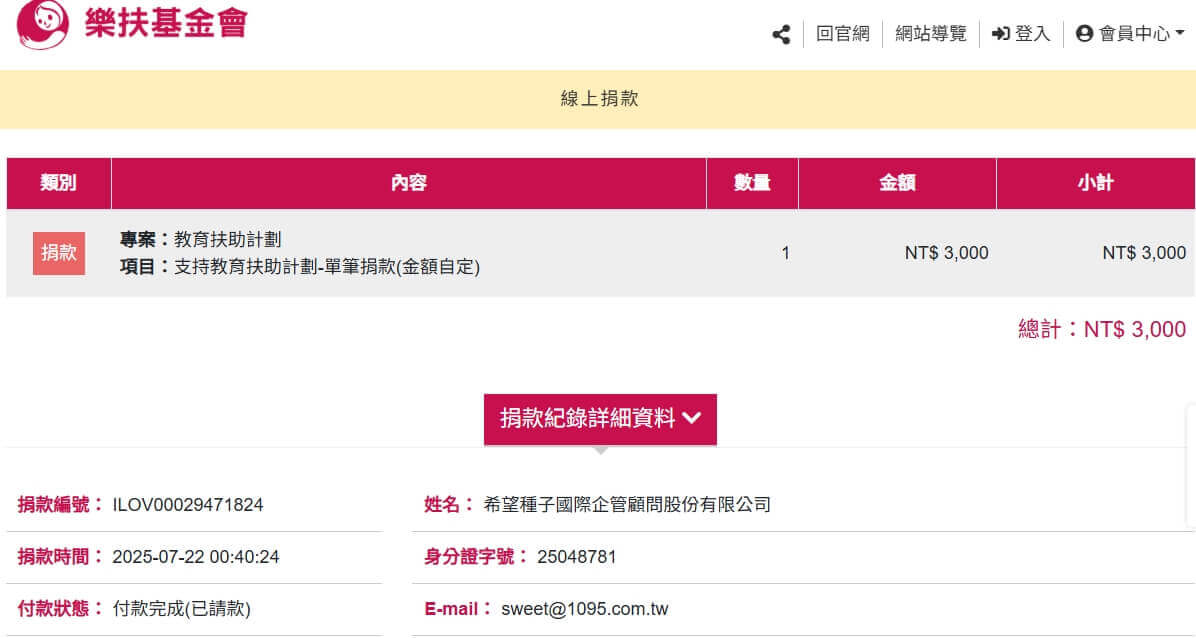 愛心款項$3,000元,已捐給您指定的【財團法人台南市樂扶社會福利慈善事業基金會】