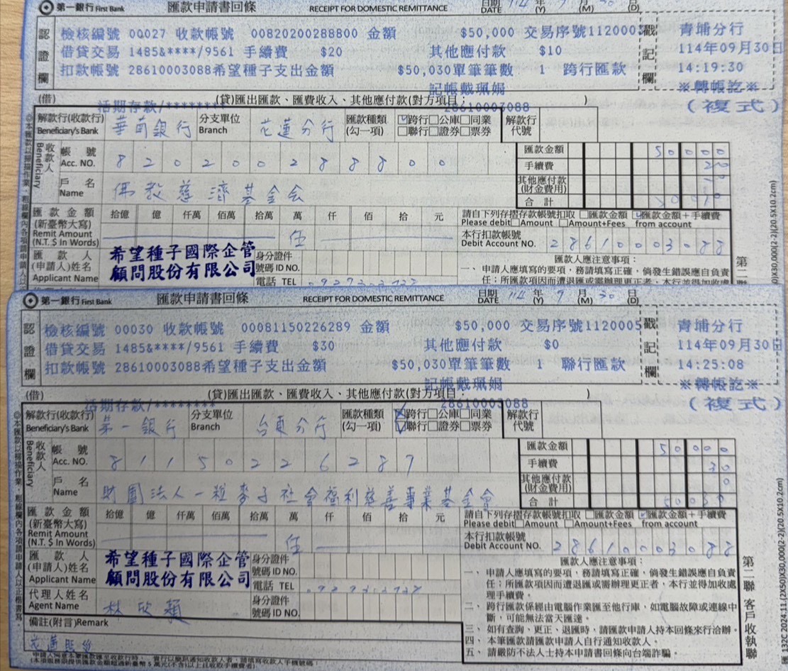 本次賑災捐款$100,000元,已捐給【財團法人均一一粒麥子社會福利慈善事業基金會】【佛教慈濟基金會】
