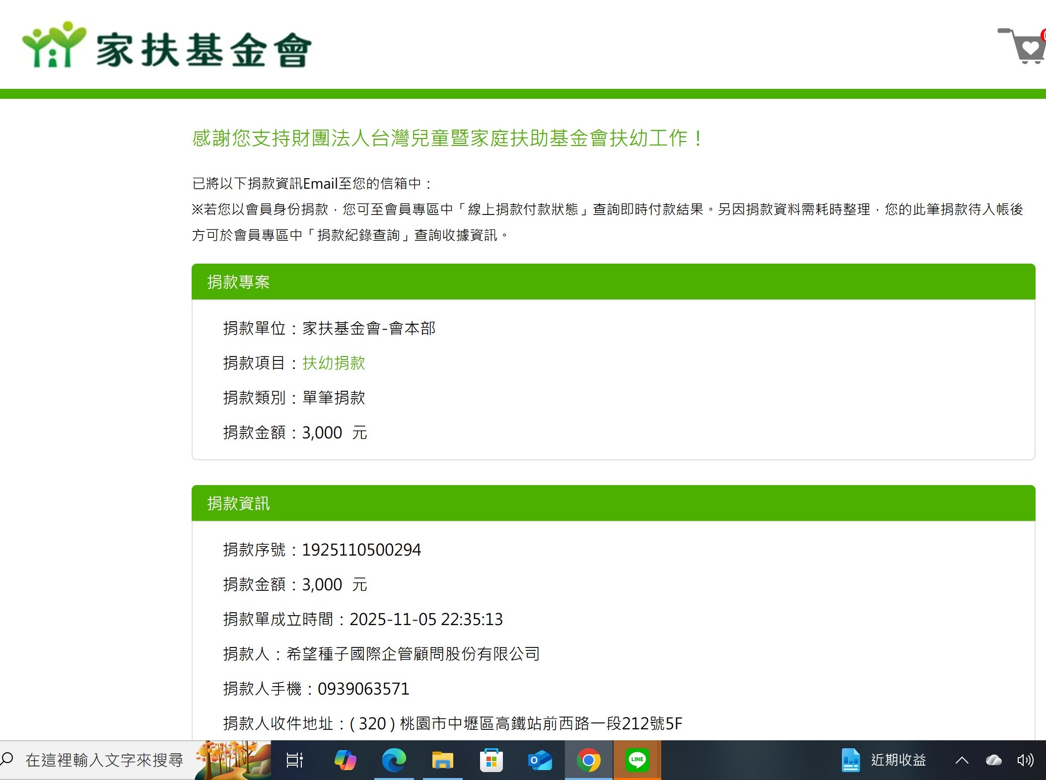 愛心款項$3,000元,已捐給您指定的【 財團法人台灣兒童暨家庭扶助基金會】