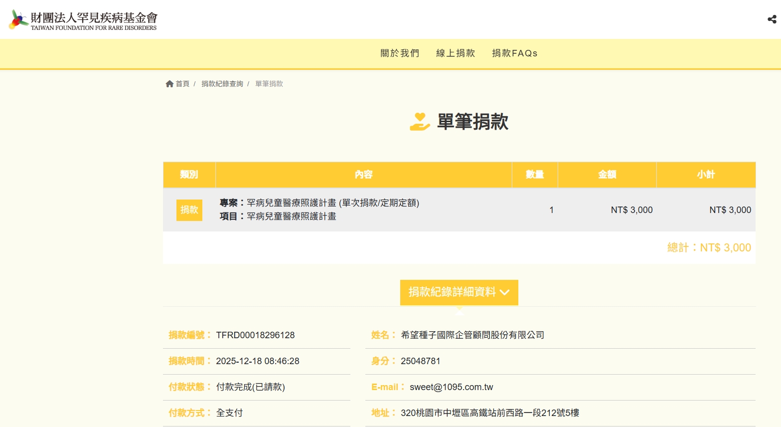 愛心款項$3,000元,已捐給您指定的【 財團法人罕見疾病基金會】