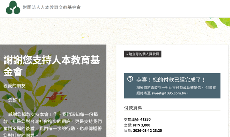 愛心款項$3,000元,已捐給您指定的【 財團法人人本教育文教基金會】