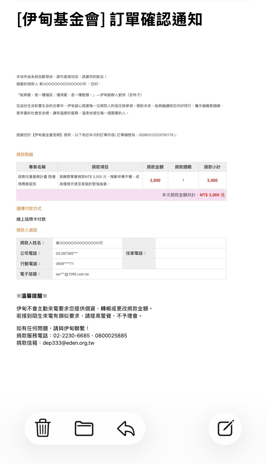 愛心款項$3,000元,已捐給您指定的【 財團法人伊甸社會福利基金會 】