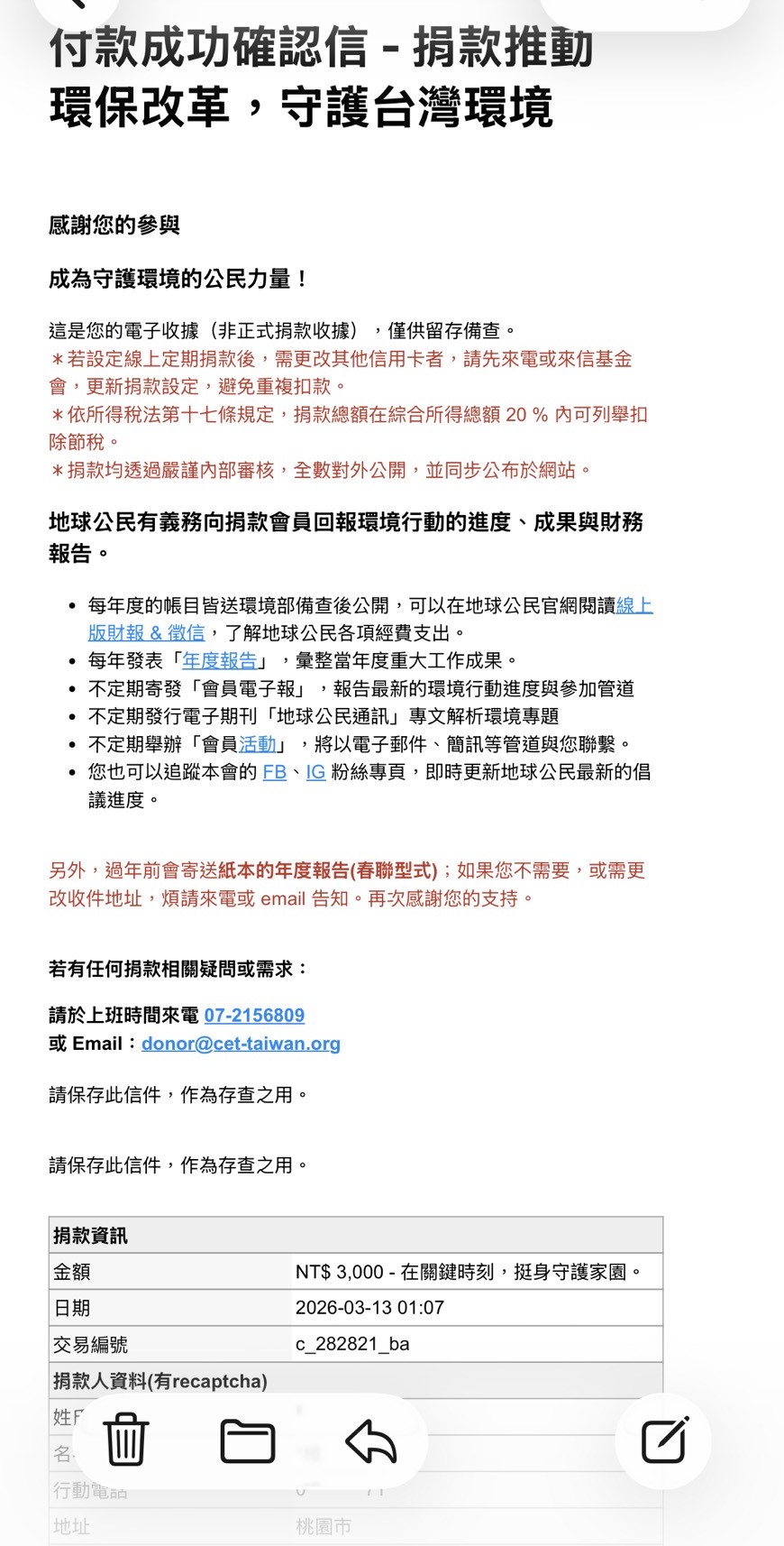 愛心款項$3,000元,已捐給您指定的【 財團法人地球公民基金會 】