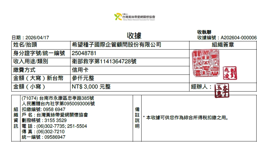 愛心款項$3,000元,已捐給您指定的【社團法人黃絲帶愛網關懷協會 】