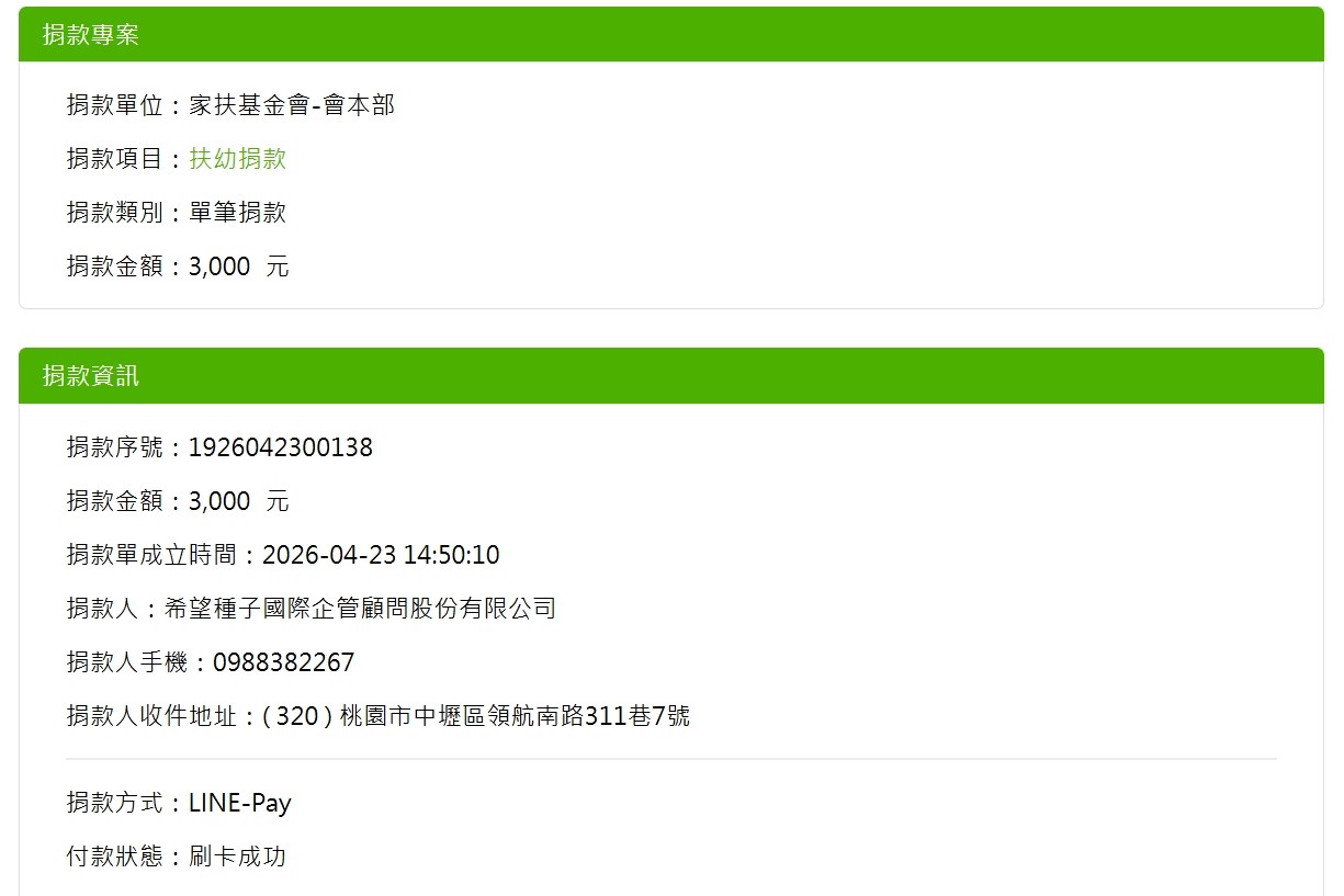 愛心款項$3,000元,已捐給您指定的【財團法人兒童暨家庭扶助基金會 】